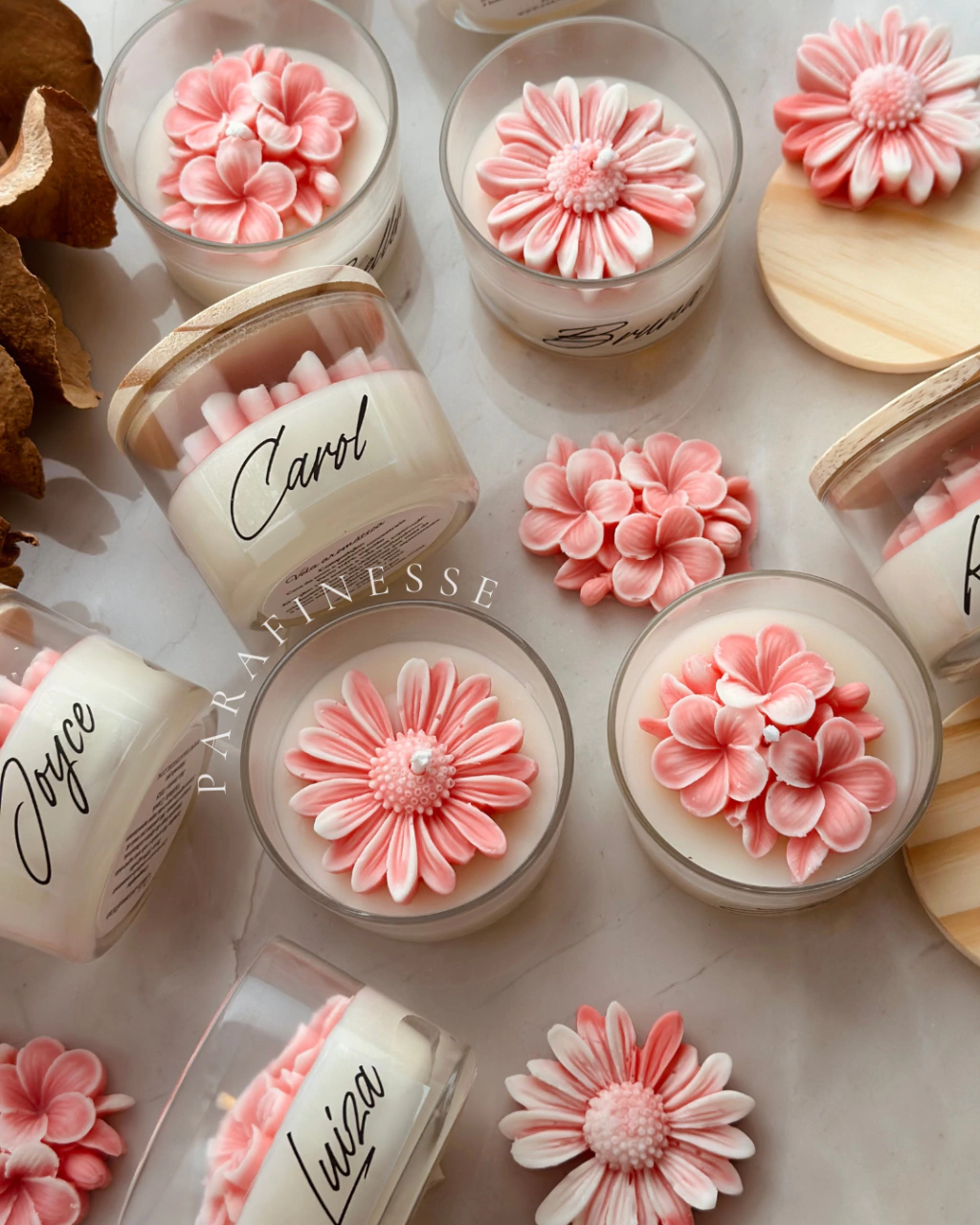 Lembrancinha vela aromática 100% vegetal no copo 150 ml com flor modelo hortência e margarida como mostrado na foto e etiqueta personalizada com tampa de madeira.